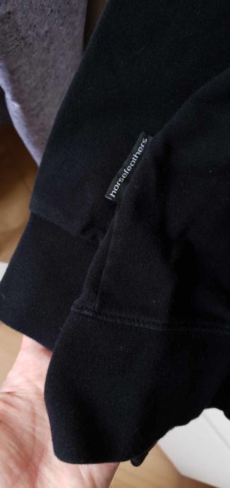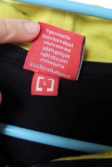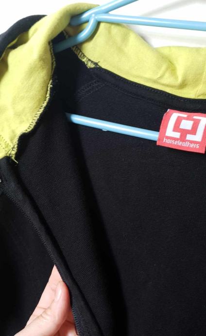 Nova ženska črna poletna (tanjša) jopa na zadrgo in s kapuco (svetlo zelena notranjost) znamke Horsefeathers, logotip v prsnem predelu je vijolično-rumen.