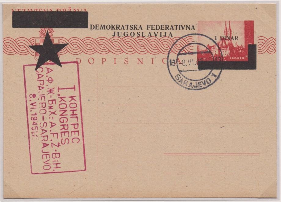 Prodajam dvojnike in ostale viške iz svoje zbirke. Jugoslavija, originalna provizorična dopisnica Demokratska federativna Jugoslavija DFJ 1945 – izdaja za Sarajevo žig AFŽ - Antifašistična fronta žena - Protifašistična fronta žensk.