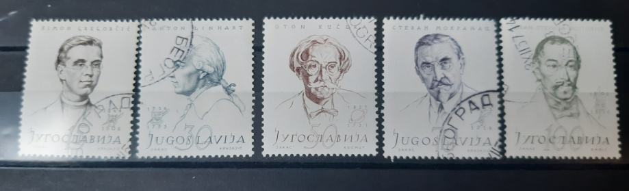Prodajam dvojnike in ostale viške iz svoje zbirke. Jugoslavija, celotna žigosana serija slavni možje 1957, številka po katalogu Michel: 834/8, kataloška vrednost: 17 €.