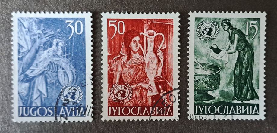 Prodajam dvojnike in ostale viške iz svoje zbirke. Jugoslavija, celotna žigosana serija ZN, UNO, 1953, kataloške številke Michel: 714/6, kataloška vrednost (Michel): 7 €.
