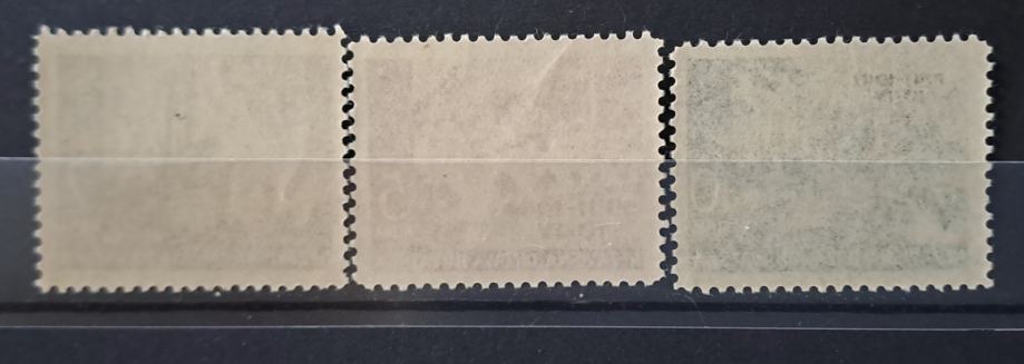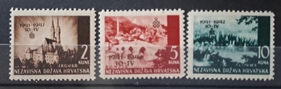 Prodajam dvojnike in ostale viške iz svoje zbirke. NDH, Hrvaška, Hrvatska, celotna nežigosana serija, 1942 dan neodvisnosti, kataloške številke Michel: 78/80, kataloška vrednost (Michel): 3,5 €.