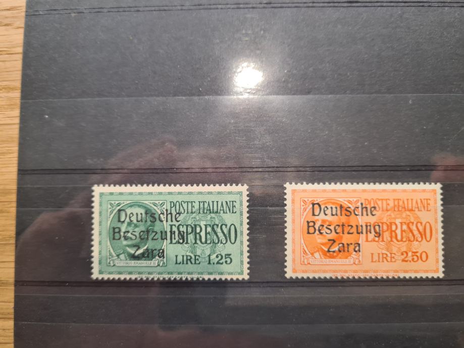 Italijanske znamke espresso (2 vrednote) z pretiskom Deutsche Besetzung Zara, znamke so v odličnem stanju in so podpisane od strokovnjaka Chiavarello, guma je perfektna, naklada znamke za 2,50 lir je samo 5000 kom