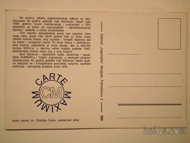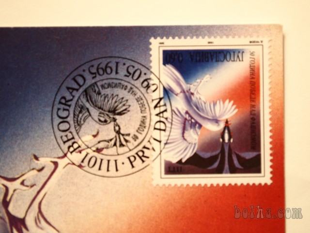 Znamka na priložnostni razglednici, 09.05.1995, 50 obletnica zmage nad fašizmom.