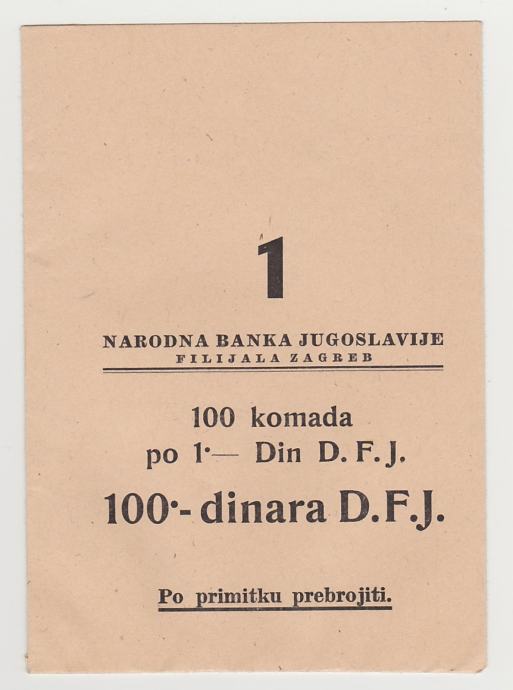 Prodaja se kuverta za 100 kom po 1 dinar D.F.J. Dimenzije 98 mm x 138 mm. Filijala Zagreb, perfektno ohranjena.