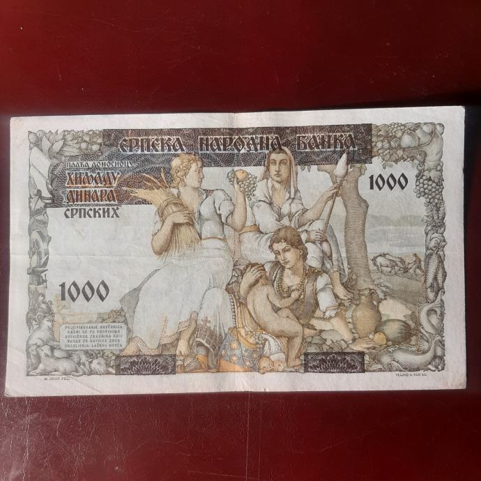 Ohranjen bankovec 1000 dinarjev iz leta 1941 iz okupirane Jugoslavije.