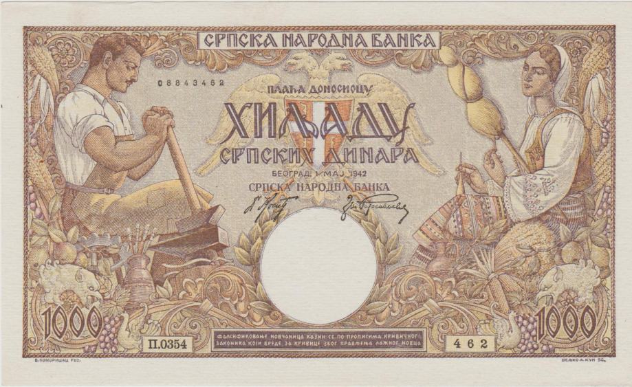 Prodam REDEK BANKOVEC 1000 DINARA P32b - VODNI ZNAK ŽENSKA GLAVA ( LJOTIĆEVA SRBIJA JUGOSLAVIJA ) 1942.UNC. "Kvizling Dimitrij Ljutić -FAŠISTIČNA OBLAST SRBIJE V OKUPIRANI JUGOSLAVIJI."