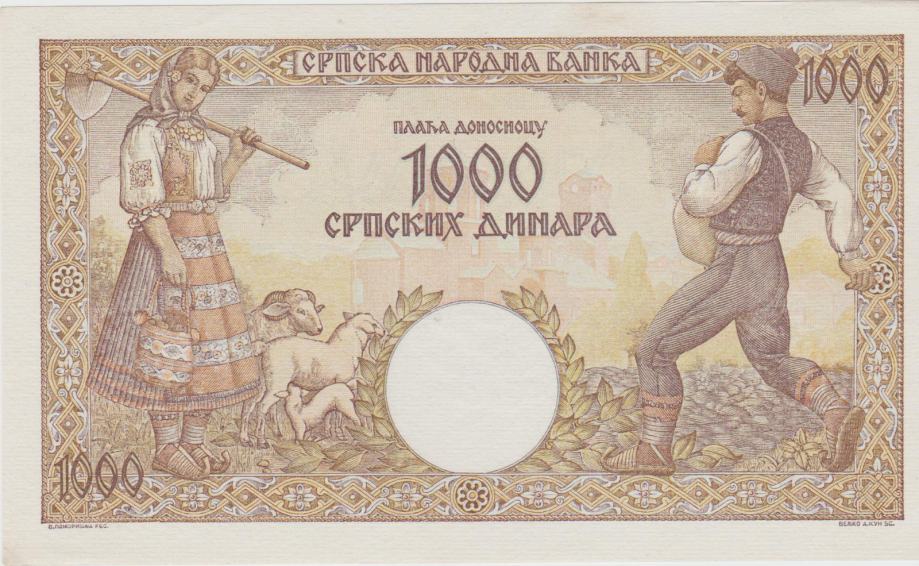 BANK. 1000 DIN vod znak Ž.GLAVA (LJOT.SRBIJA JUGOSLAVIJA)1942.UNC