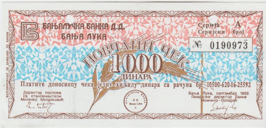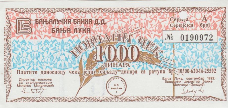 BANK. NOVČANI ČEK1000 DINARA 1992, ŽIG(BOSNA SRBSKA REPUBLIKA)aUNC