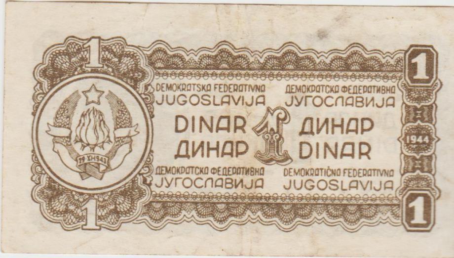 BANKOVEC 1 DINAR P4a " Milivoje Rodić" (DEM. JUGOSLAVIJA)1944,VF/XF