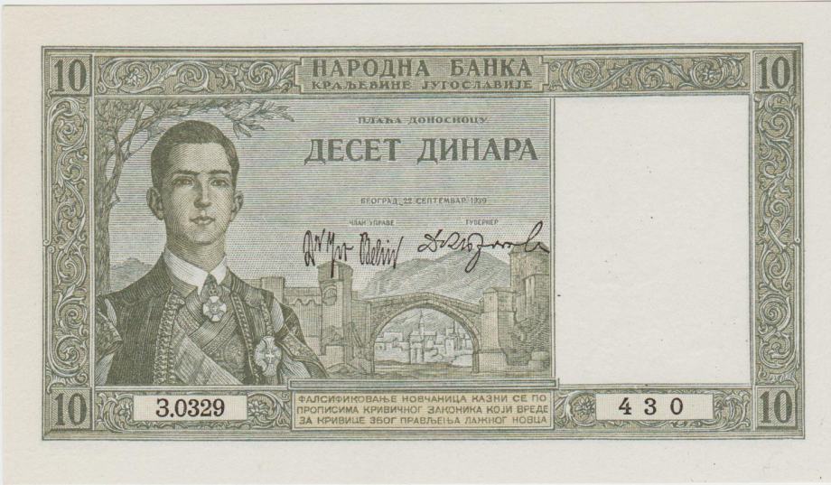 Prodam BANKOVEC 10 DINARA P35 "kraljica MARIJA in kralj PETER II." vodni tisk kralj PETAR I. (KRALJEVINA JUGOSLAVIJA) 1939.UNC kvaliteta.