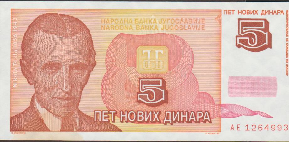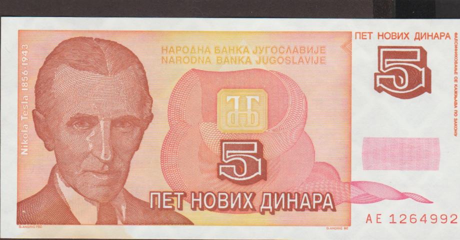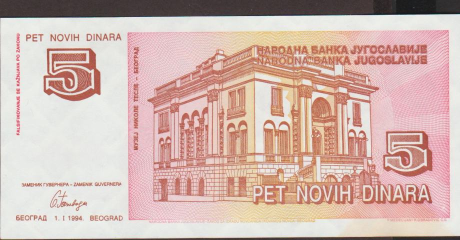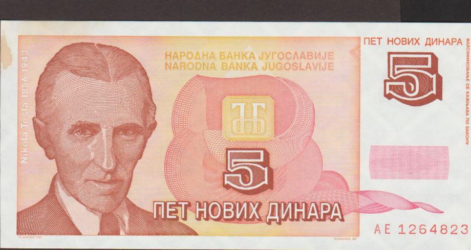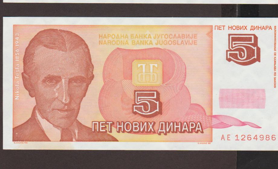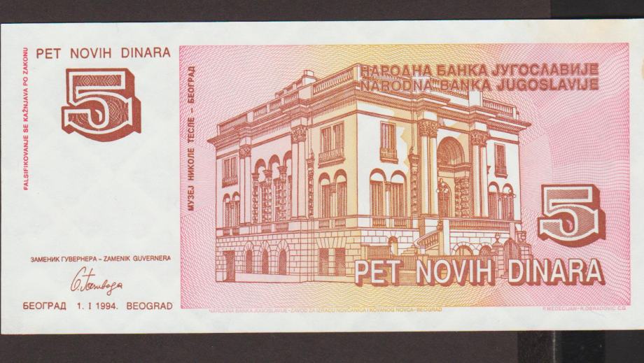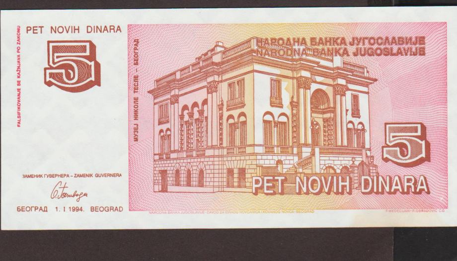 Prodam REDEK BANKOVEC 5 NOVIH DINARA P146 (JUGOSLAVIJA) 1.1.1994.XF++/aUNC kvaliteta. CENA JE ZA 1 BANKOVEC