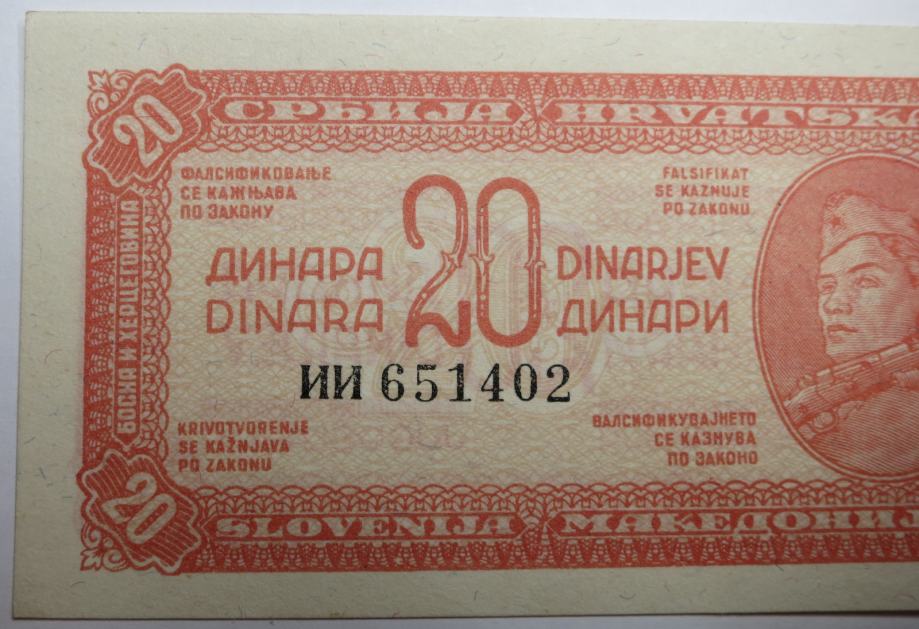 Odlično ohranjen bankovec za 20 dinarjev iz leta 1944.