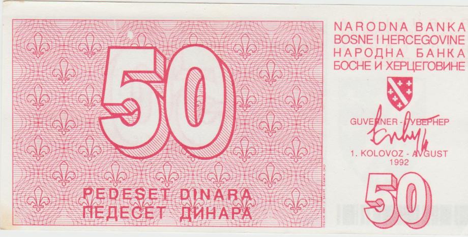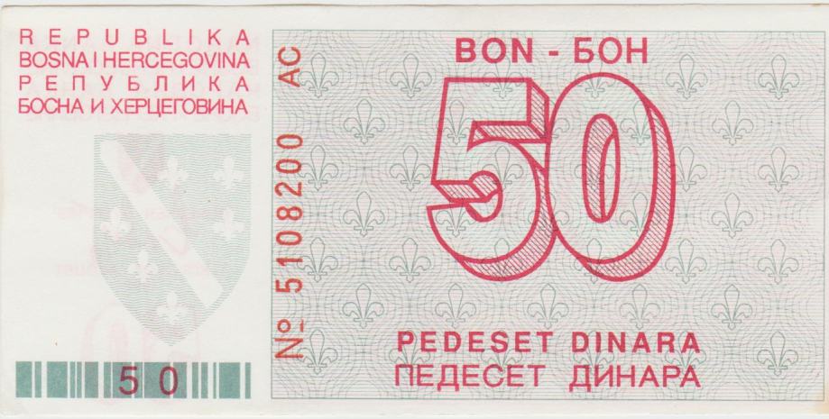 NOVČANI BON 50 DINARA P23 (BOSNA IN HERCEGOV. BIH ) 1.8.1992.aUNC