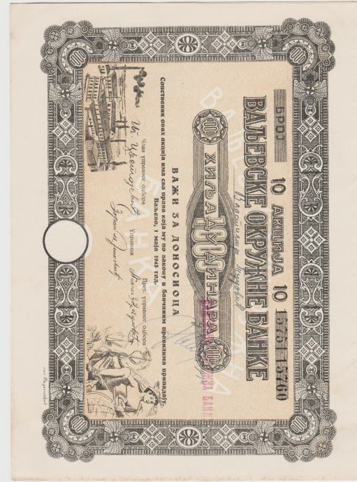OBVEZ.VALJEVSKE BANKE 1000 DIN,17 TAL.(KRAL. JUGOSLAVIJA)1943.aUNC/UNC