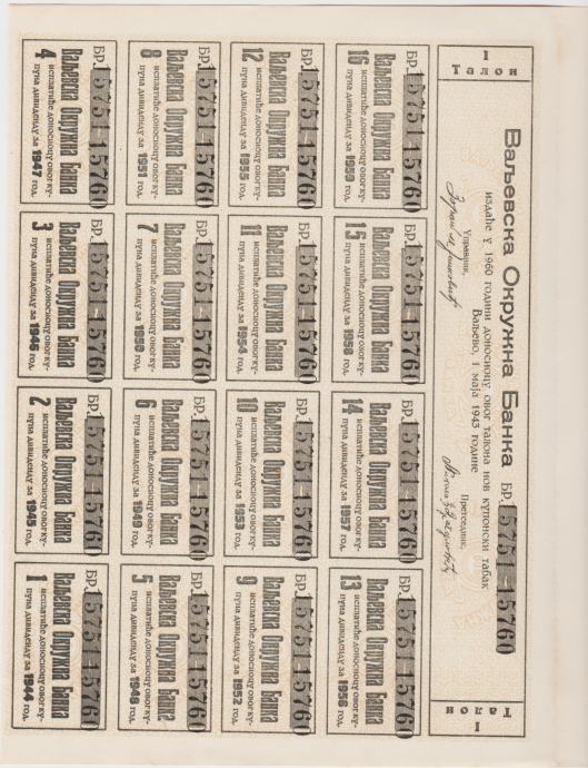 Prodam ZELO REDKO OBVEZNICO VALJEVSKE BANKE 1000 DINARA Z 17 UNC NEIZPLAČANIH TALONOV št. 15751 do 15760 , izplačljiva 17 LET-KUPONI od leta 1944 do 1960. (SRBIJA KRALJEVINA JUGOSLAVIJA)1943.aUNC/UNC kvaliteta.