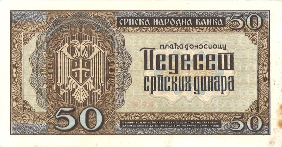 Prodam bankovec na fotografiji: Srbija 50 dinara 1. maj 1942, aUNC, madež na levem robu