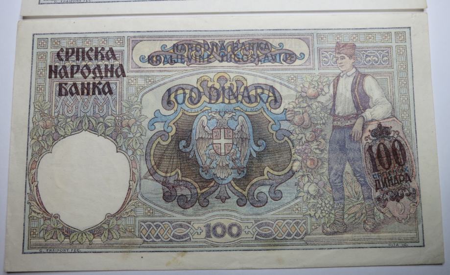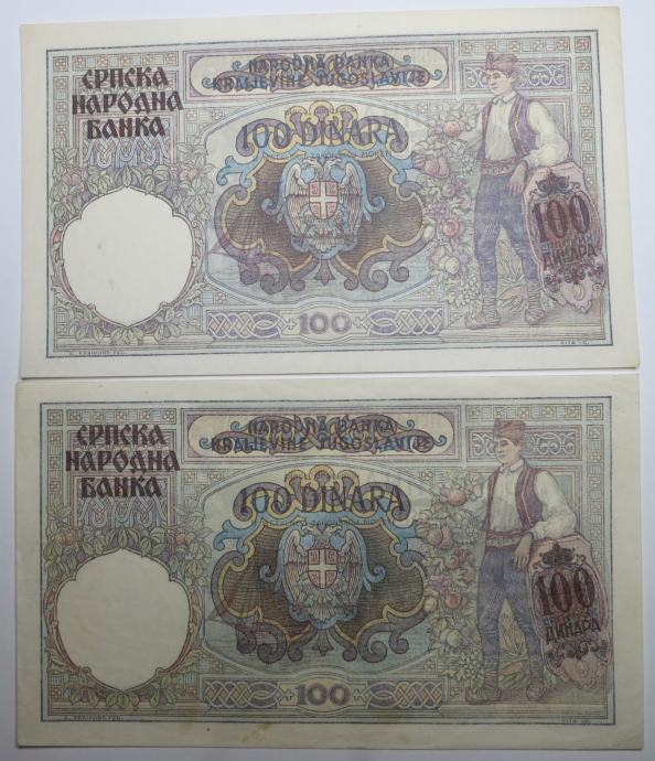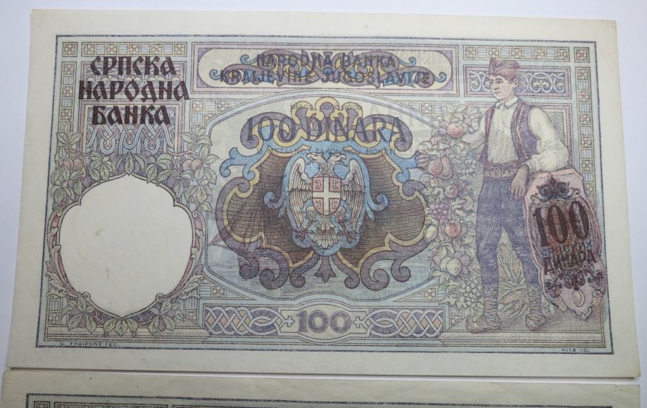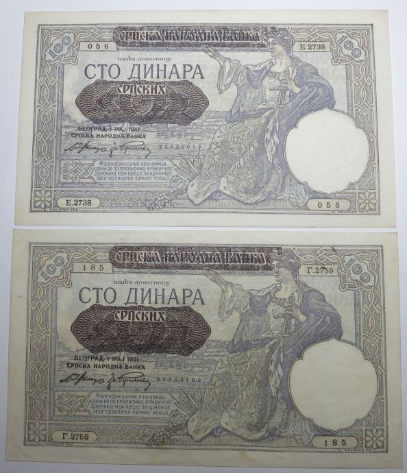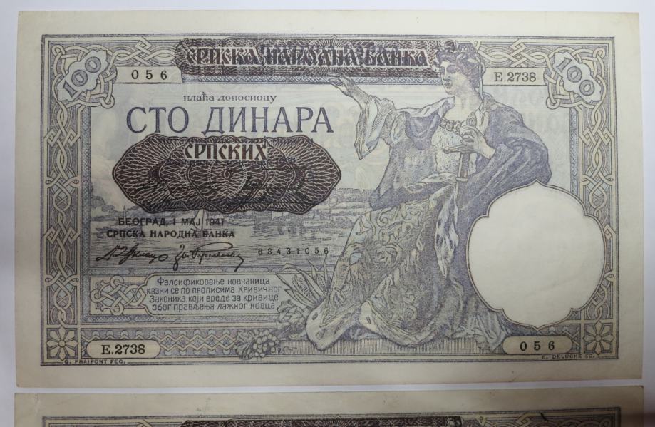Prodajata se 2 bankovca za 100 dinarjev 1941 v VF+ in AU kvaliteti. Čas druge svetovne vojne in nemške okupacije.