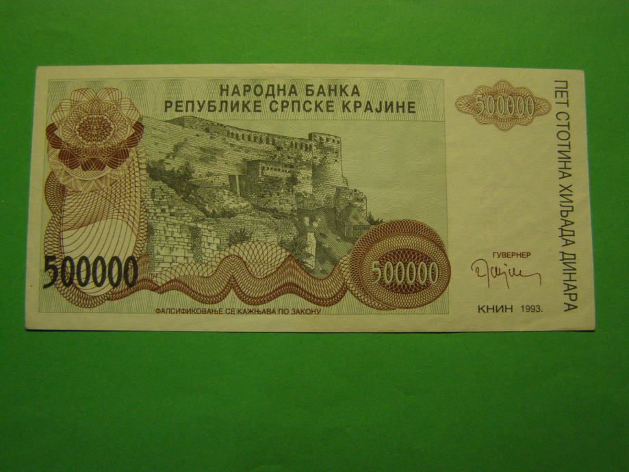 Prodam bankovec za 500.000 din iz Republike Srbske Krajine - (Knin Trdnjave) Rebublika Hrvaška, kot ga vidite na fotografijah. Bankovec bi lahko rekli, da je v XF+++ ohranjenosti.