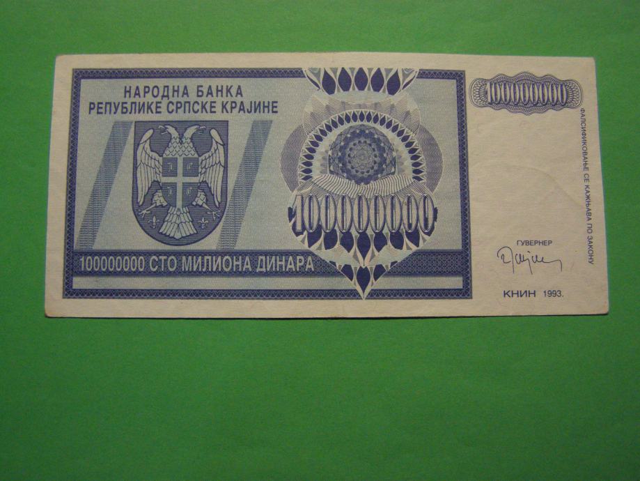 Prodam vojni bankovec 100000000 Dinarjev (100 mio.) iz Srpske Krajine - Republika Hrvaška; Knin 1993, kot ga lahko vidite na fotografijah. Slednji je sicer iz obtoka, vendar ohranjen in XF + kvalitete.