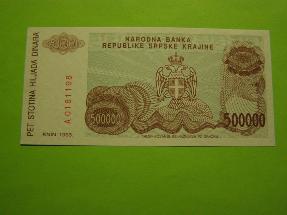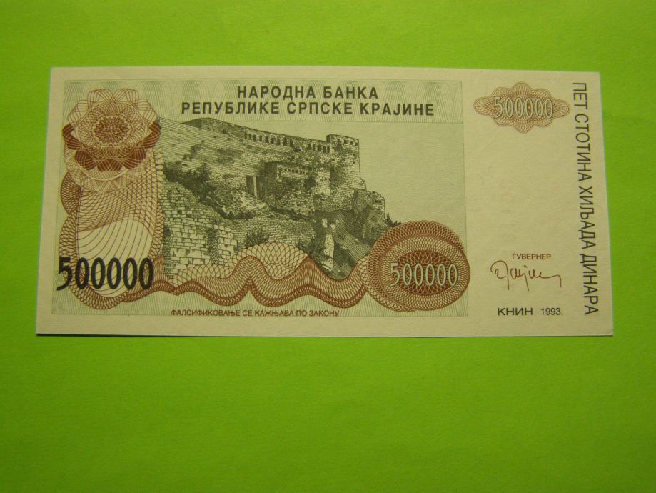 Prodam bankovec za 500000 Dinarjev iz Srpske Krajine - Republika Hrvaška; Knin (Trdnjave), kot ga vidite na fotografijah. Bankovec je sicer nov, vendar je aUNC kvalitete..