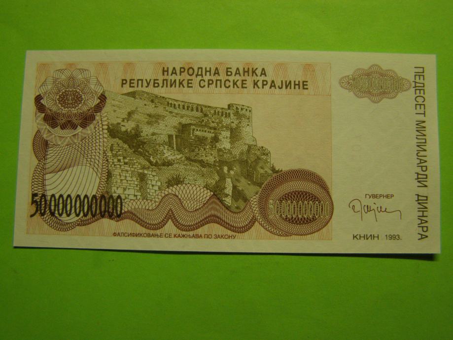 Prodam bankovec za 5000000000 Dinarjev (5 mrd.) iz Srpske Krajine - Republika Hrvaška; Knin (Trdnjave), kot ga vidite na fotografijah. Bankovec je povsem nov - UNC kvalitete.