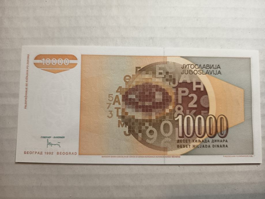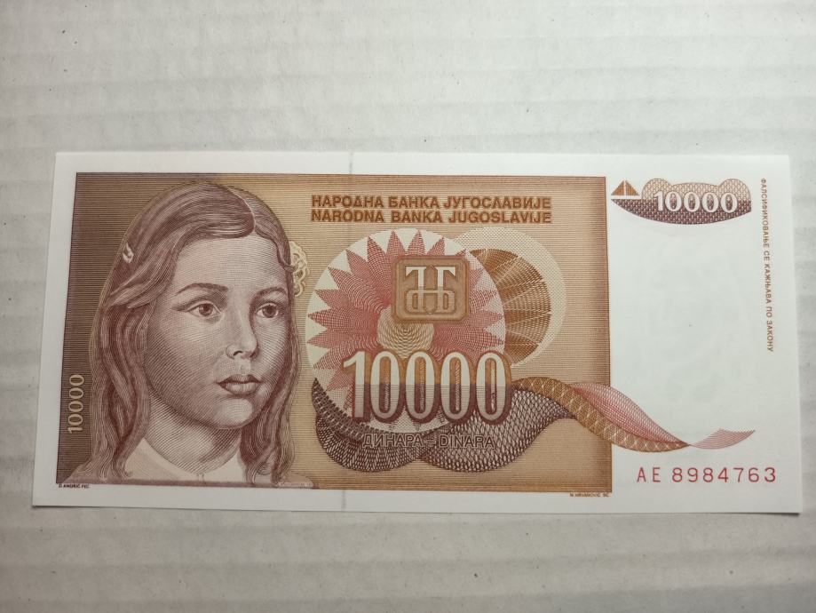 Prodam bankovec ZR Jugoslavija 1992 10.000 dinarjev UNC serija AE Z NAPAKO.