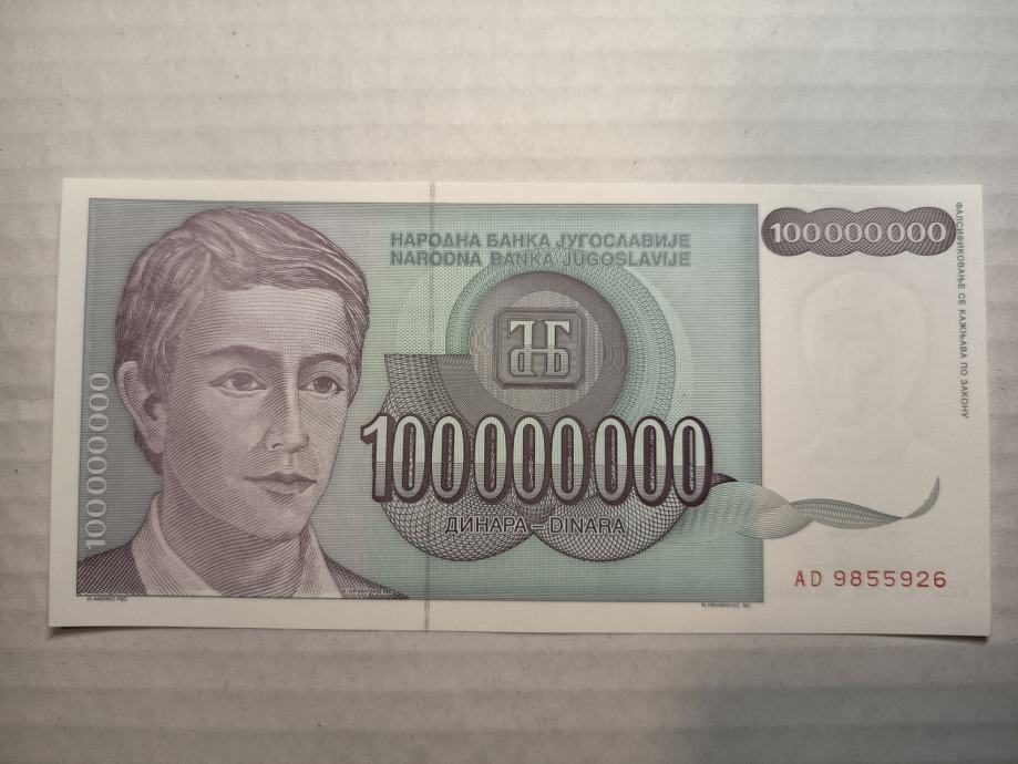 Prodam bankovec ZR Jugoslavija 1993 100.000.000 dinarjev UNC serija AD.