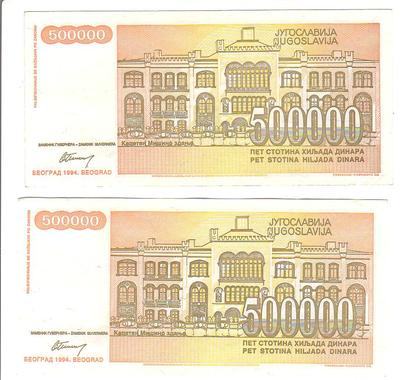 ZR Jugoslavija 500.000 1994 s črtico pri podpisu XF/aUNC