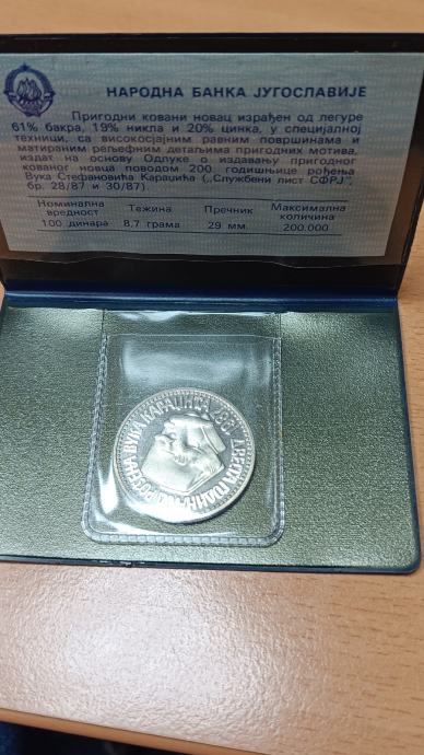 SPOMINSKI KOVANEVC JUGOSLAVIJA 100 DINARA 1987 VUK KARADŽIČ - HIBRID