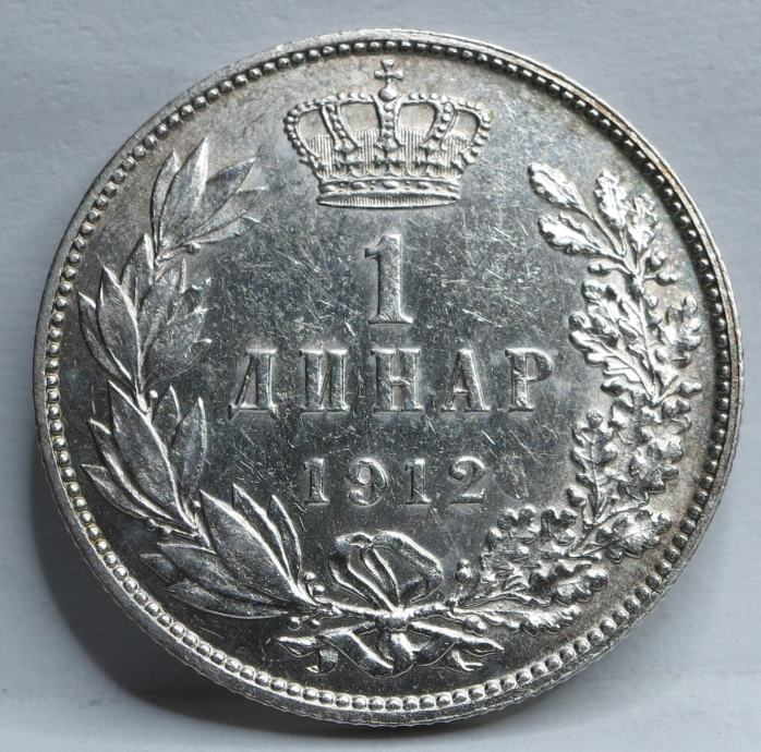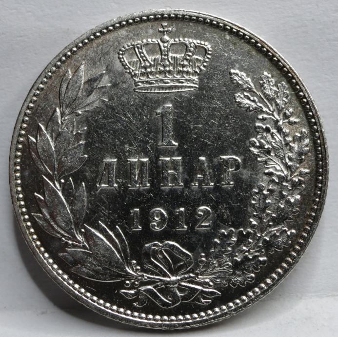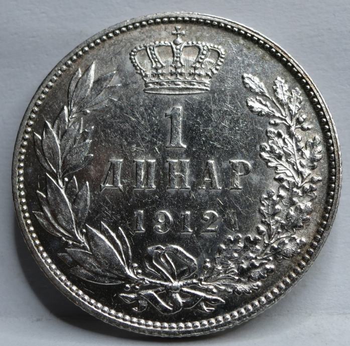 Odlično ohranjen srebrnik 1 Dinar Kraljevine Srbije letnik 1912. Lep sijaj in ohranjenost.