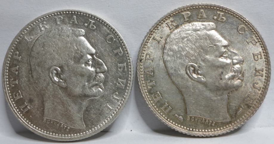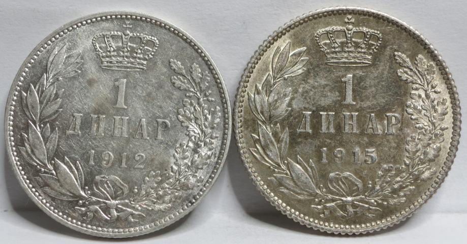 Prodam lot 2x po 1 Dinar 1912 in 1915, zelo lepo ohranjena srebrnika. Letnik 1912 je dobre XF kvalitete, letnik 1915 pa s podpisom graverja SCHWARTZ in v visoki AU/ UNC kvaliteti in lepim kovnim sijajem.