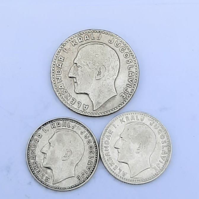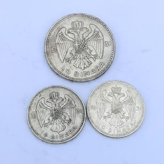 Iz svoje zbirke prodam srebrnike 20+10 dinarjev (obe varjanti). V kompletu trije kovanci.10 dinarjev z oznako kovnice in brez oznake.