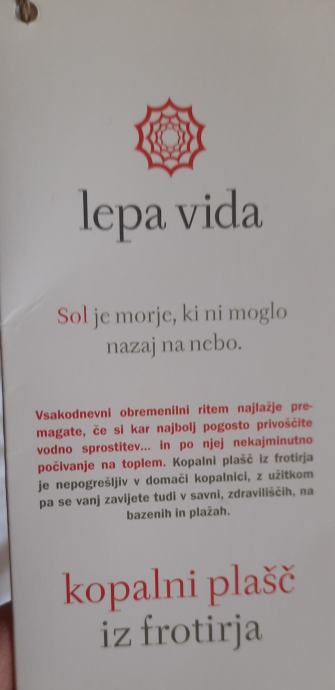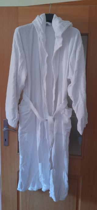 Prodam nikoli uporabljen kopalni plašč iz frotirja snežno bele barve, zelo prijazen koži, velikost L
