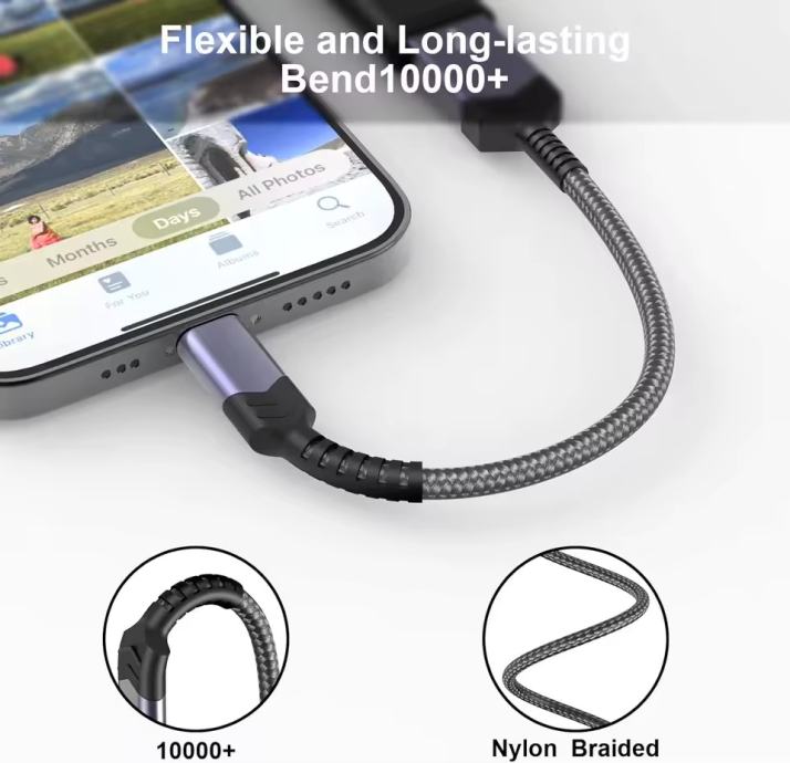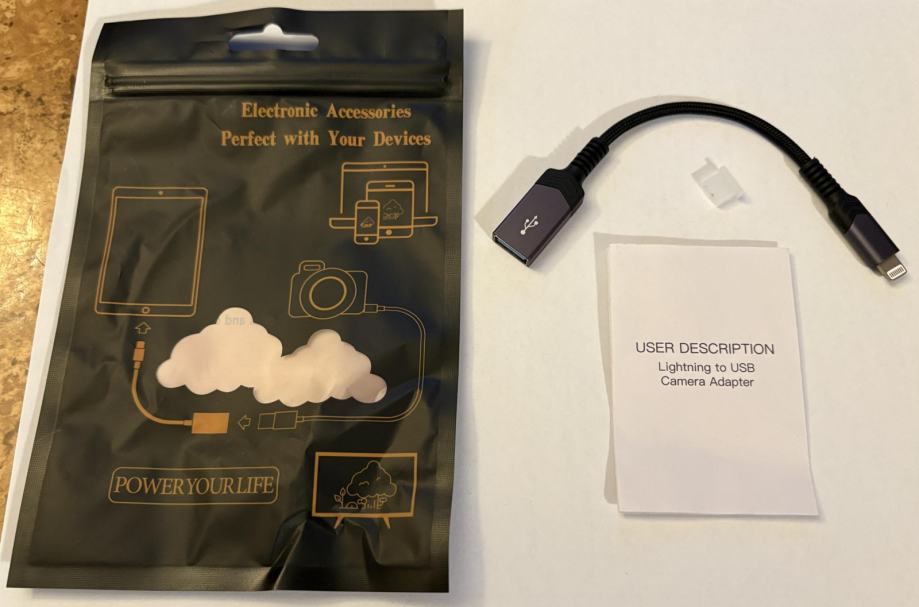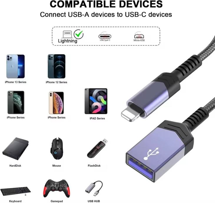 Prodam nov kabel / pretvornik iz USB-A ženski konektor v Lightning moški konektor. Uporaben za priklop USB-A naprave kot je USB ključek, čitalec kartic, tipkovnica, miška, fotoaparat, disk, gamepad, ipd. na napravo z Lightning vhodom in podporo funkciji OTG (USB On-The-Go).