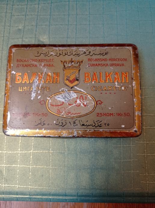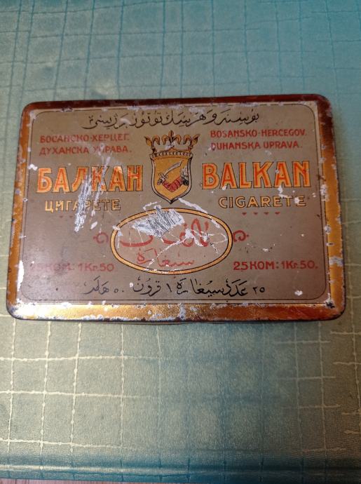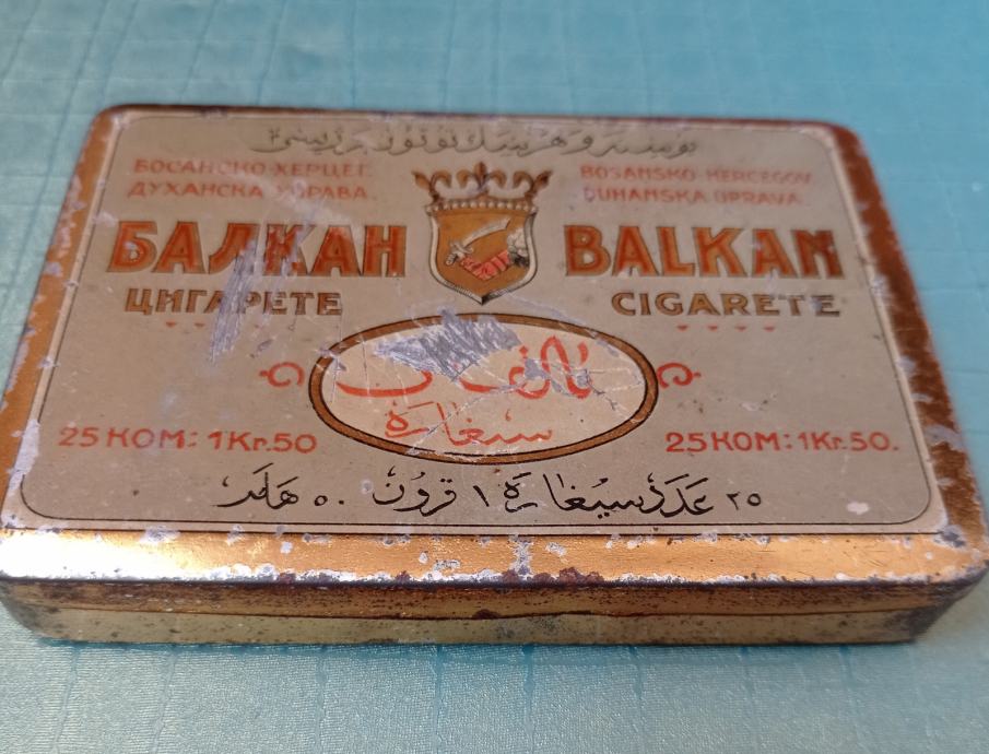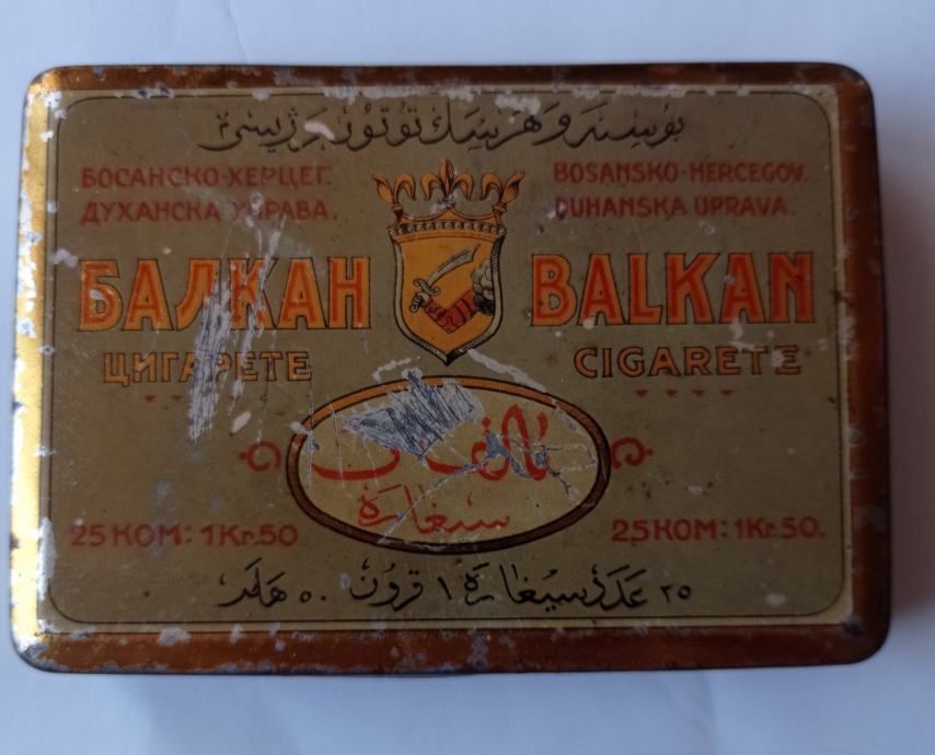 Prodam starinsko plehnato škatlico Balkan cigarete Bosna in Hercegovina.Iz leta 1920 - 1930 Dimenzije 11 cm x 7,7 cm x 1,6 cm