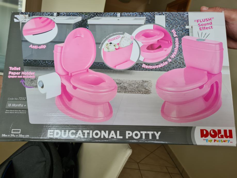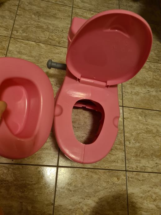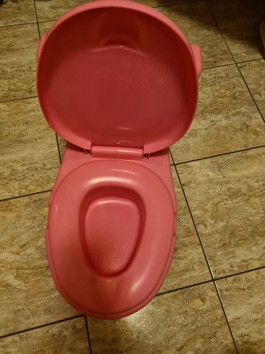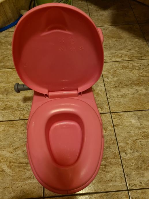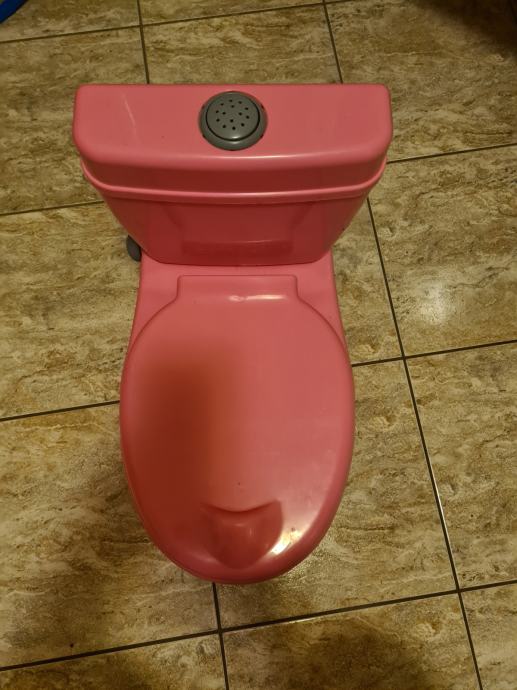 Prodam lepo ohranjeno, roza kahlico, v obliki wc školjke. Ima držalo za wc papir, prostor za shranjevanje in gumb z zvočnim efektom potega vode.