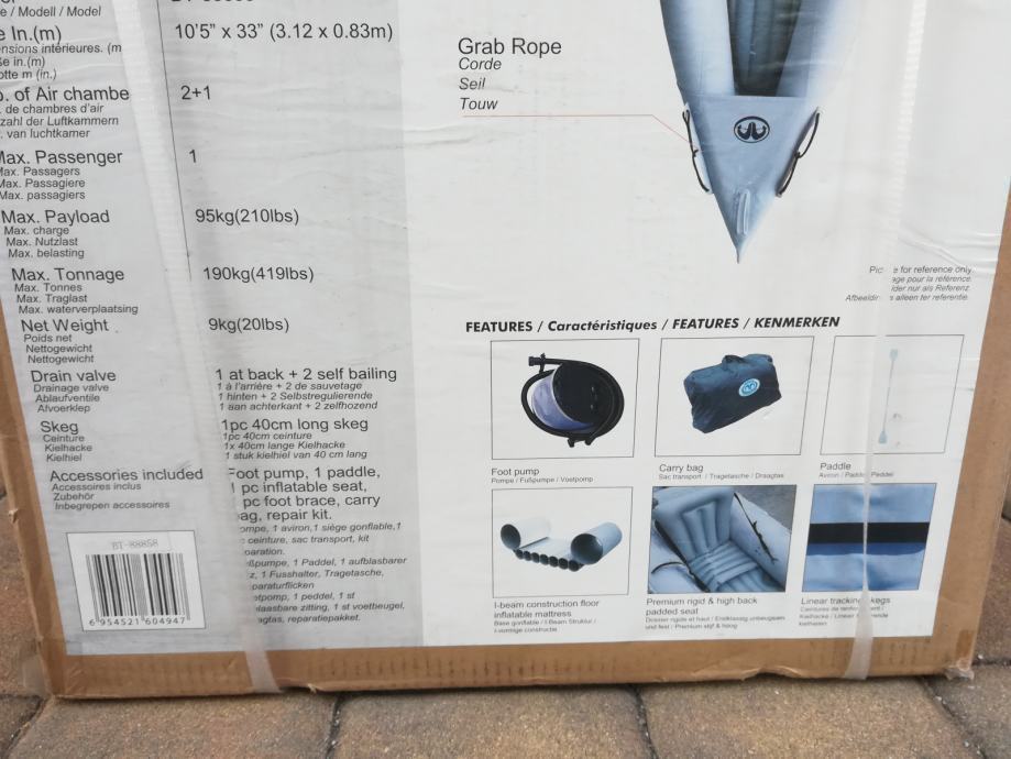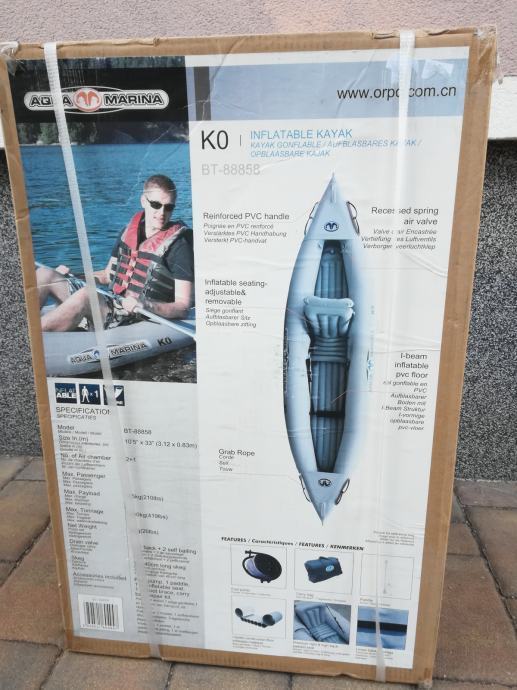 Neuporabljen, zelo kvaliteten material(enak motornim gumenjakom),dimenzije 195x85cm, z vso opremo(veslo, tlačilka,sedež,....)