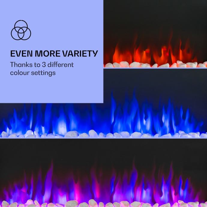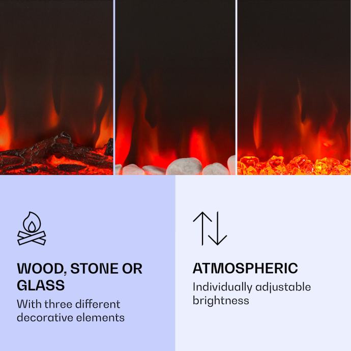 Funkcionalna stenska dekoracija nekoliko drugačne vrste: z električnim kaminom Klarstein Galeras boste svoj dom izboljšali z lepim in toplim stenskim kaminom. S pritiskom na gumb na priročnem daljinskem upravljalniku omogočite, da plamen kamina zažari v različnih barvah in z različno svetlostjo. Vgrajeni termostat, ki ga je mogoče nastaviti med 16 in 30 °C, zagotavlja prijetno temperaturo. Z nastavljivim tedenskim časovnikom lahko nastavite posamezne čase ogrevanja in se prepustite prijetni toploti in navdihujočim barvam. Zaradi svoje preproste zasnove se stenski in vgradni kamin Galeras odlično prilega vsakemu okolju.