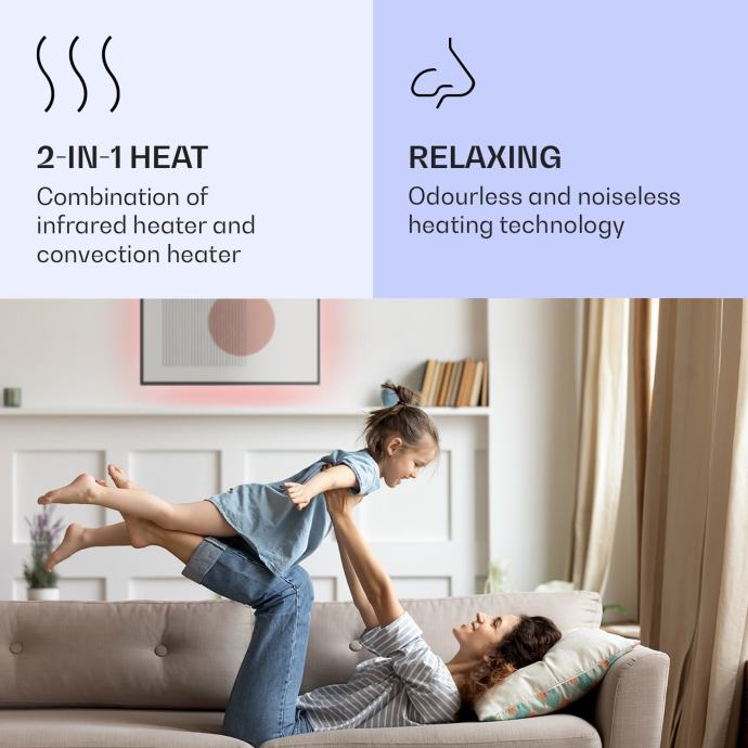 Z dvojno močjo pri enaki velikosti Grelniki Klarstein Mojave grelniki 2 v 1 spretno združujejo infrardeči sevalni grelnik in konvektor ter tako ne le hitro ustvarjajo občutljivo infrardečo toploto v prostorsko varčni zasnovi, temveč tudi ustvarjajo prijetno topel zrak v prostoru, saj se toplota dviga od zadaj. Glede na velikost prostora lahko izberete grelnik z močjo 500, 750, 900 ali 1000 W. Termostat, ki ga lahko nastavite v stopinjah, in tedenski časovnik se upravljata zelo inteligentno prek aplikacije Klarstein ali daljinskega upravljalnika. Zahvaljujoč zaščitnemu razredu IP44 so konvektorji idealni tudi za kopalnico. Ne glede na to, kam obesite svojo novo ogrevalni panel Klarstein Mojave Smart, bo s svojo barvito ambientalno svetlobo RGB ustvarila pravo vzdušje, kjer koli ga boste postavili.