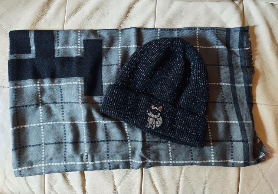 1. ORIGINAL KARL LAGERFELD ZIMSKA PLETENA BEANIE KAPA, ČRNE BARVE + SREBRNA NIT + POTISK MUCKA IZ KAMENČKOV, 91% VOLNA + 9% POLIESTER.