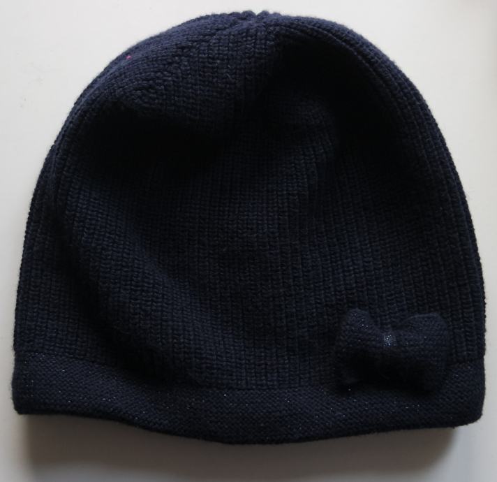 Lepo ohranjena, kot nova kapica (sestava bombaž, najlon, poliamid in volna) priznane znamke Jacadi Paris, podložena s flisom, temno more barve, rob in mašnica z rahlo bleščečo nitjo.