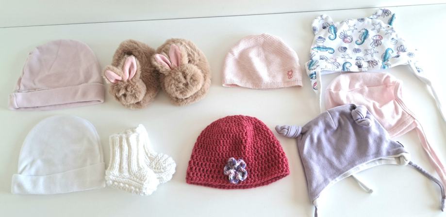 Prodamo vse, kar je na sliki. 7 kap različnih velikosti , 2 para copatkov za novorojenčka.