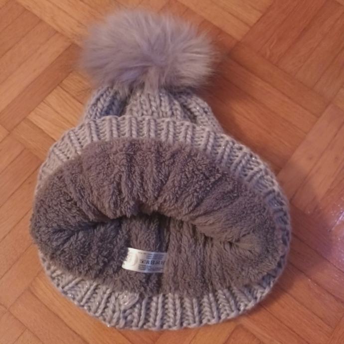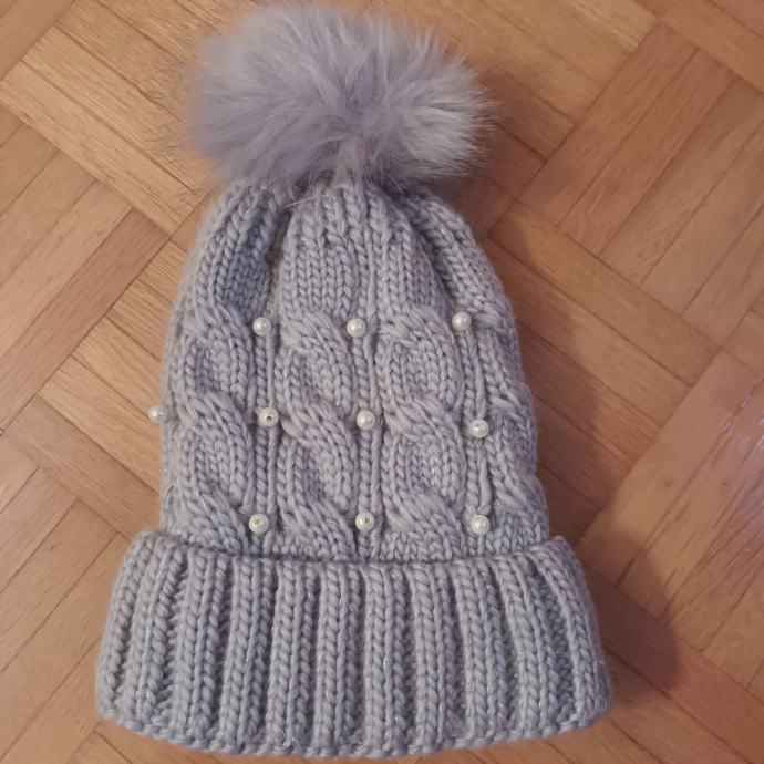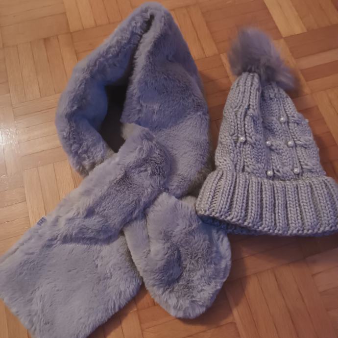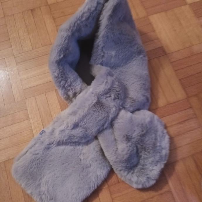 Komplet šal iz umetnega krzna in štrokana kapa s perlami (s podlago) v sivi barvi, prodam.