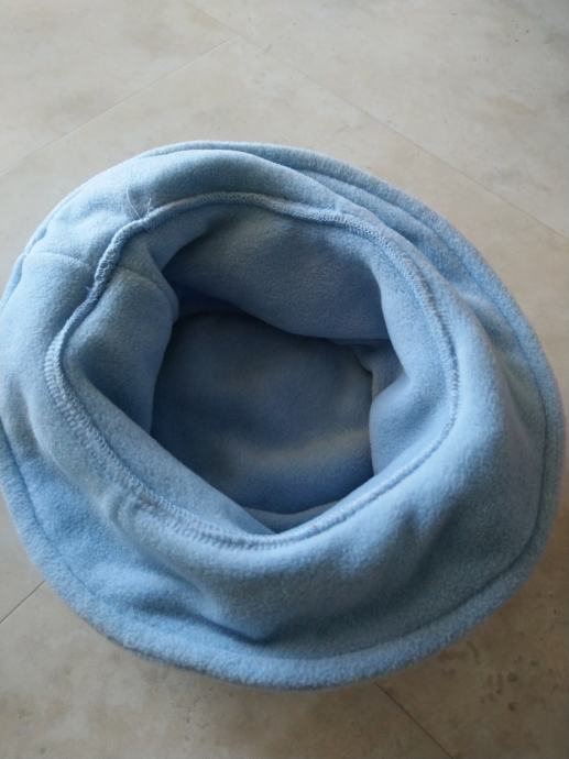 Dekliški klobuk s pentljico iz flisa v nežno modri barvi. Velikost 4/104. Višina 10 cm, obseg 59 cm. 100% poliester.
