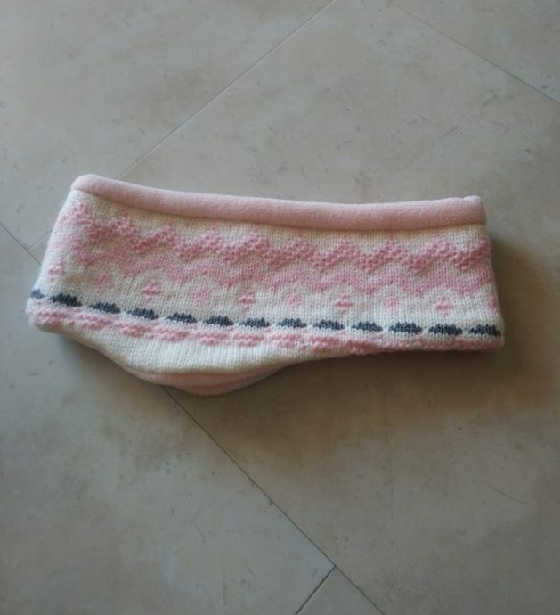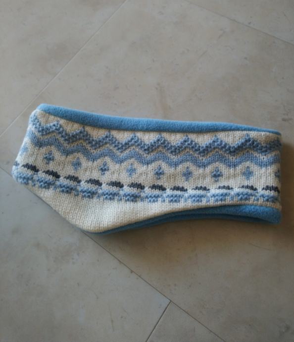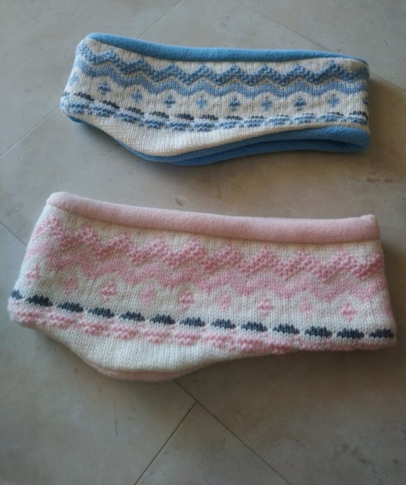 Dva zelo topla pletena trakova podložena s flisom. Prvi v modrem odtenku, drugi v roza odtenku. Velikost S. Dolžina 26 cm, širina 8 cm, čez uha 11 cm. Zunanja stran: 50 % volne in 50 % poliester, notranja stran: 100 % poliester. Moder je nov, roza parkrat uporabljen.