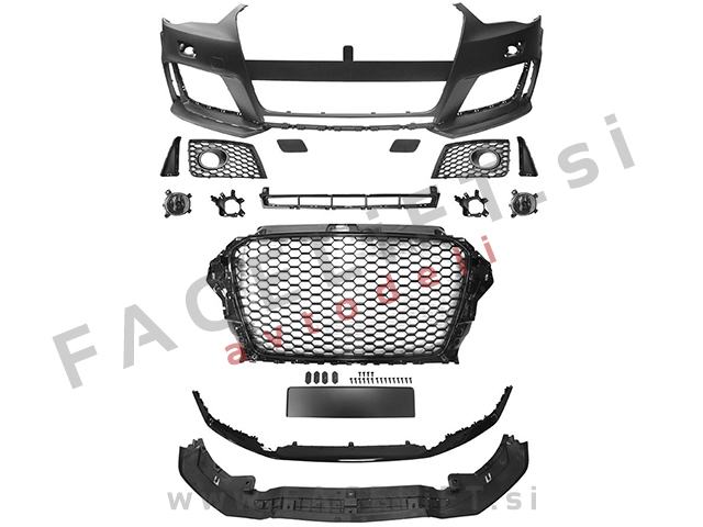 Sprednji odbijač RS3 izgled z črno (sijaj) masko. V kompletu prejmete sprednji odbijač, pokrov vlečne kljuke, pokrove sistema za pranje žarometov SRA, mrežice meglenk, meglenke, in ostalo kot je prikazano na sliki. Odbijač je nov in pripravljen za barvanje (v primerju).