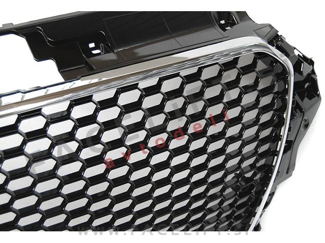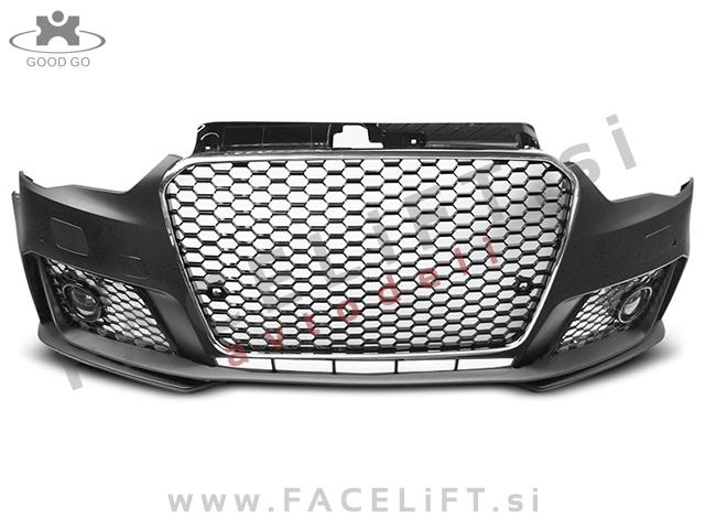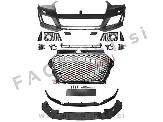 Sprednji odbijač RS3 izgled z kromiramo (sijaj) masko. V kompletu prejmete sprednji odbijač, pokrov vlečne kljuke, pokrove sistema za pranje žarometov SRA, mrežice meglenk, meglenke, in ostalo kot je prikazano na sliki. Odbijač je nov in pripravljen za barvanje (v primerju).