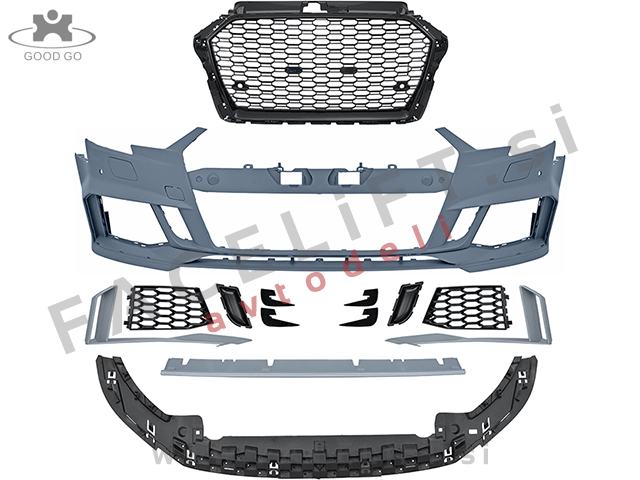 Sprednji odbijač RS3 izgled. V kompletu prejmete sprednji odbijač, levo mrežo, desno mrežo, masko, pokrov vlečne, pokrove sistema za pranje žarometov SRA in ostalo kar je prikazano na sliki in potrebno za montažo. Odbijač je nov in pripravljen za barvanje (v primerju).