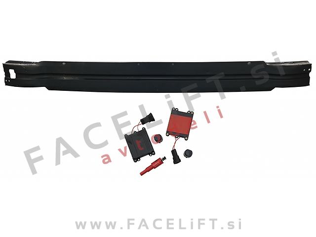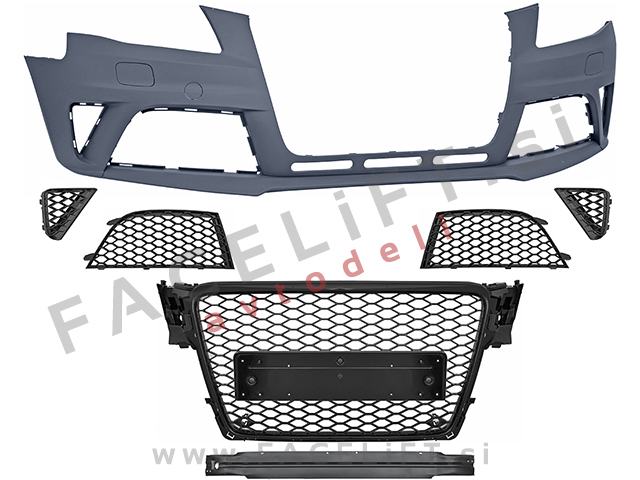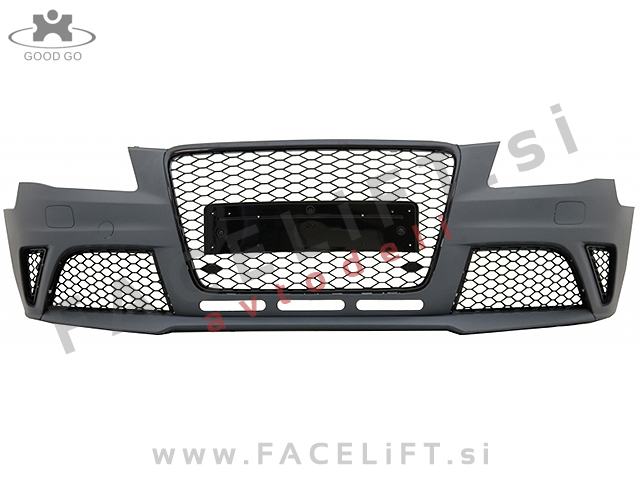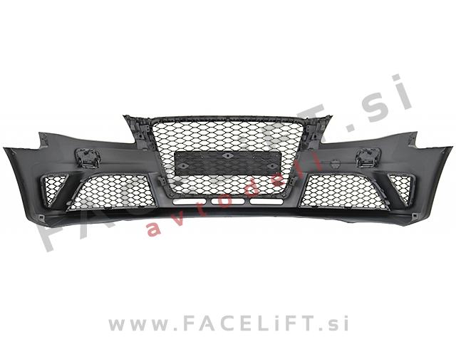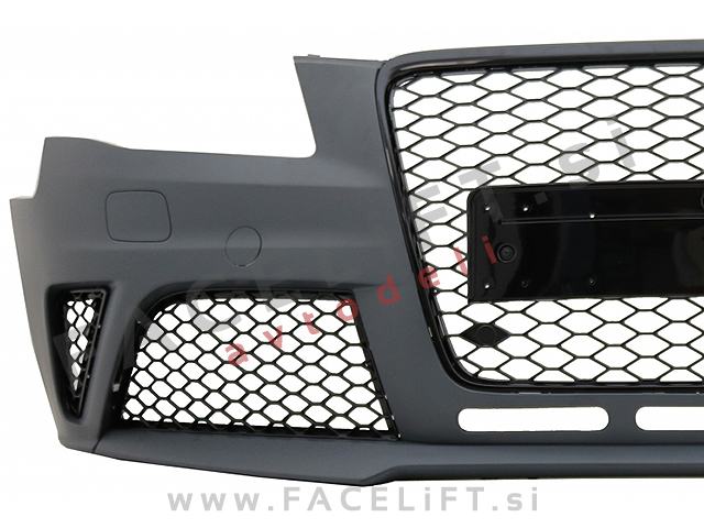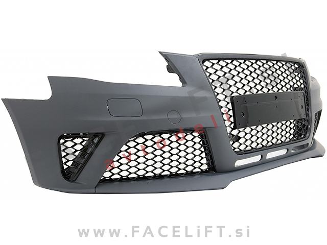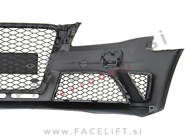 Sprednji odbijač RS4 izgled. V kompletu prejmete sprednji odbijač, pokrov vlečne kljuke, pokrove sistema za pranje žarometov SRA, levo in desno spodnjo mrežo, masko, nosilec odbijača in upore, ki preprečijo napako na računalniku po odklopu meglenk. Odbijač je nov in pripravljen za barvanje (v primerju).