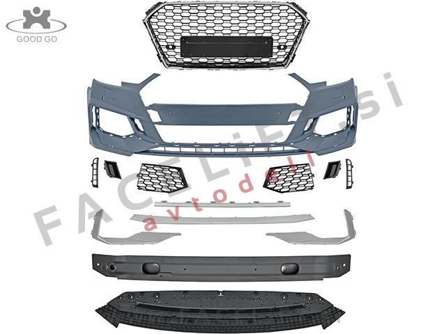 Sprednji odbijač RS4 izgled. V kompletu prejmete sprednji odbijač, mreže, masko in ostalo kar je prikazano na sliki in potrebno za montažo. Odbijač je nov in pripravljen za barvanje (v primerju).